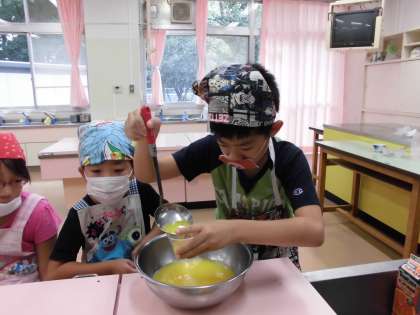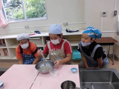 身支度、道具の準備などは、自分たちで進めました。班の友達と協力し、事前学習のプリントで手順を確かめながら、ぜりー液を作りました。各自が持ち寄った器に入れてから、冷蔵庫で冷やしました。「早く固まらないかなぁ…」「食べるのが楽しみ!」子どもたちは、それぞれ楽しみにしていました。今日は、調理時間は短かったので、後片付けをきちんと済ませることも学習のめあてでした。