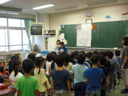 今朝の音楽集会は、教室で行われました。1年生は6年生の教室へ、2年生は5年生の教室へ、3年生は4年生の教室へと、それぞれの「きょうだい学級」に合流しました。