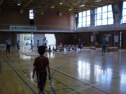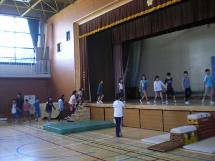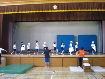 今週の土曜授業日、キッズフェスティバルに向けて、明日コマーシャル集会があります。そのリハーサルを、中休みの体育館で行いました。全学年が思い思いの方法で、宣伝の発表をしました。