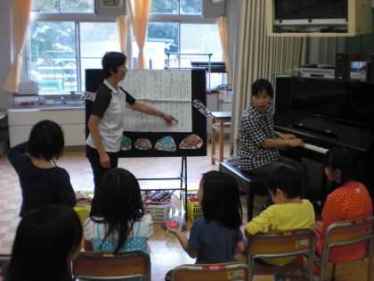 後半は、「流れ星」で、身体全体を使ったリズムゲーム、そして最後にリズム遊びをしました。みんなで楽しそうに学習し、満足そうでした。