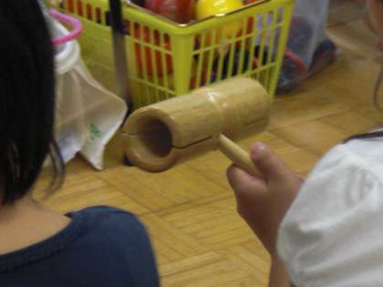 始めに「虫の声」や「いろんな木の実」で、打楽器を演奏しながら、リズムに乗って歌いました。使った楽器は、タンバリン、ギロ、カスタネット、マラカス、鳴子、カバサ、ビブラスラップです。