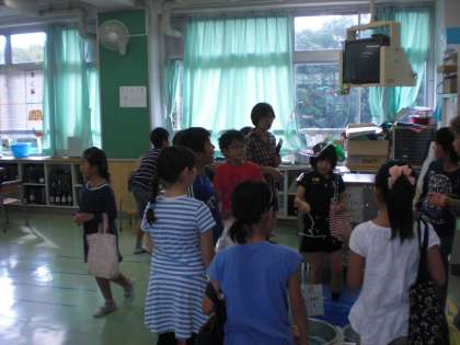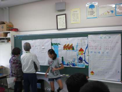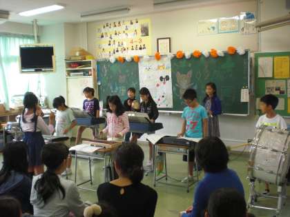 4年生の教室では、学習したことを活かした、合奏や落語、しゃぼん玉作り、「水の旅」の展示等をしていました。