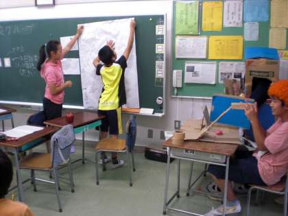 6年生の教室では、自分たちで考えた「未来の交通」、「未来の学校」、「未来のエネルギー」等をそれぞれのブースで紹介し、投票所で投票してもらいました。