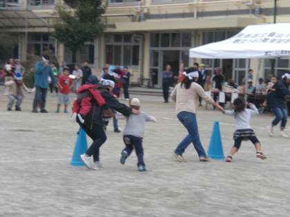 写真は、プログラム18番の「徒競走」、19番の「びんつり」、20番の「親孝行」の様子です。