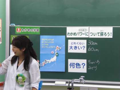 わかめの実物大の大きさや、「茎わかめ」「めかぶ」等の部位を教えていただきました。また、全員がわかめに触れて、最後に感想をまとめました。