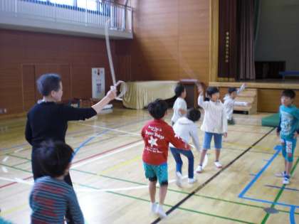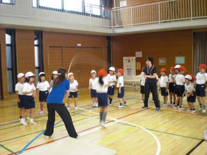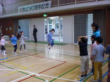 本日の中休みは雨天のため、体育館で1・2年生が長縄跳びの練習をしました。