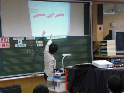 「よく考え、主体的に学習する児童の育成 〜ICTを活用して〜」という研究主題の基、4年2組で、音楽科「せんりつのとくちょうを感じ取ろう」の研究授業を行いました。