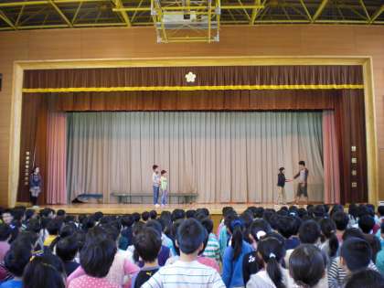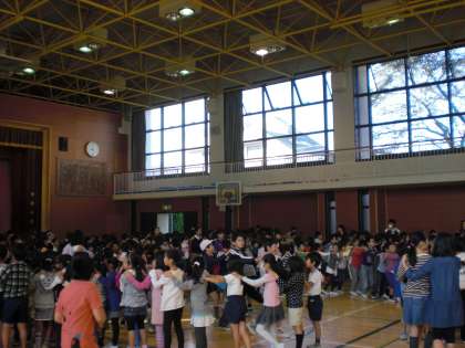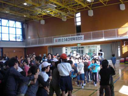 負けたら先頭になるという普段の逆のルールで、うれしいような、くやしいような、笑顔がいっぱいの全校ゲーム集会でした。