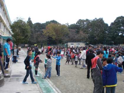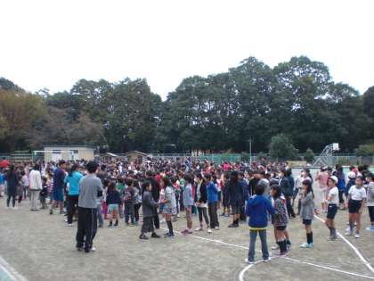 今朝は、校庭で伝言ゲーム集会を行いました。