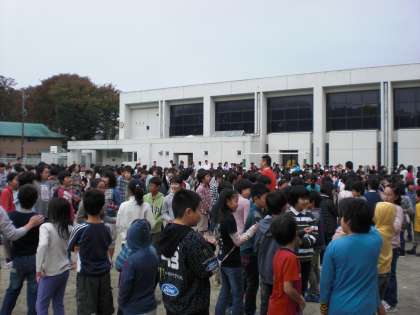 ルールは、クラスごとに1列になって伝言を回します。制限時間が3分間で、持ち点10点からの減点法で競います。3分を10秒すぎるごとにマイナス1点、また、伝言を1か所間違えるごとにも1点マイナスです。お昼の放送で結果が発表されます。
