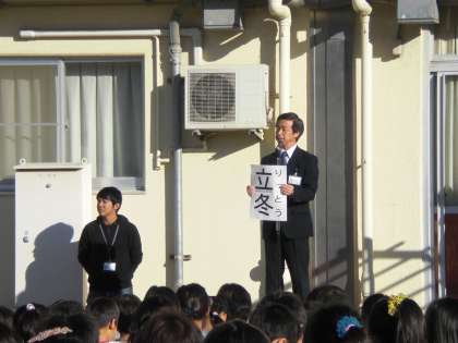 今朝は校長先生から、冬の始まりの「立冬」のお話がありました。1年生が校外学習で祖師谷公園に行き、秋を探してきたことを紹介しました。
