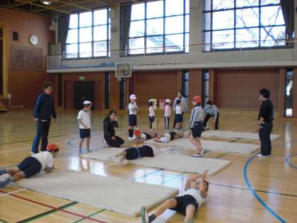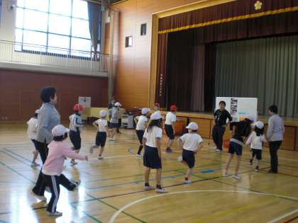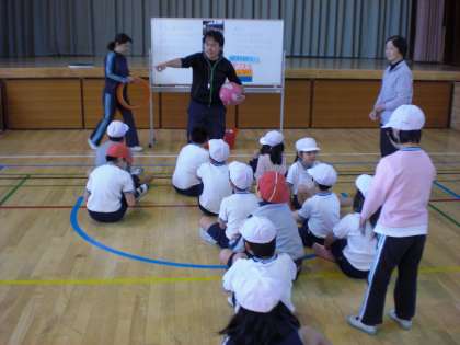 始めに、体つくり運動を行いました。そして、チームごとにパスの練習をしてから、列になって、順番でパスをつないでゴールするゲームをしました。一人ひとりが、生き生きと学習に取り組んでいました。