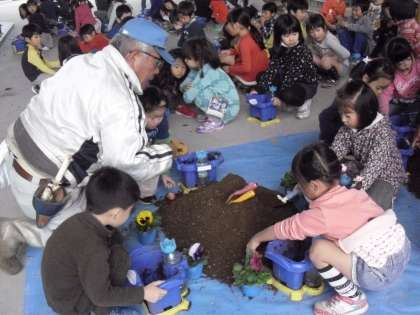 本日1年生は、朝顔を育てていた鉢植えを使って、パンジーとチューリップの寄せ植えに挑戦しました。パンジーをビニールポットから出すときには、おそるおそるだった子どもたち。地域で園芸に関わる方々から、育て方の説明をしていただくと、とても熱心に聞いていました。また、作業が終わると、「何色のチューリップが咲くんだろう。」「いつまで咲いてくれるかな。」と嬉しそうに話す姿が見られました。