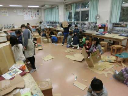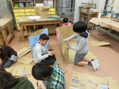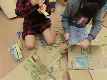 自宅から用意してきただんボールを、デザインしたり、友達と合わせることを考えあったり、それぞれが工夫して素材を活かした作品づくりに楽しく取り組んでいました。
