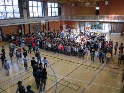 身近な曲の歌詞を集会委員が朗読し、その曲を当てるゲームです。集会委員会では、朗読の仕方を工夫すること、寒くないような工夫をすること、そして1年生もそして全校のみんなも分かり楽しめるゲームにすることをめあてに、ゲームを企画し実施しました。そこで、烏山小学校校歌、今人気の妖怪ウォッチやとなりのトトロの曲などを用意しました。みんなで○か×か考えて動き、とても盛り上がった集会となりました。