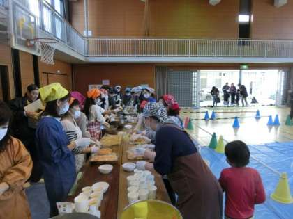 朝早くから準備に取りかかり、10時30分に開会された今年の“もちつき大会”も大盛況です。お父さんたちに加わって子どもたちももちつき体験をし、自分でついたおもちをいただいています。配膳コーナーでは、PTAのお母さんたちが、配膳スタッフとして参加している子どもたちと、5種類のおもちを配膳してくださっています。