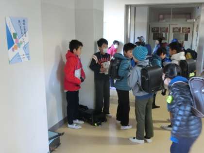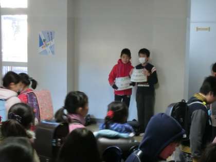 東門では、縦割り班14班があいさつの声かけを行っていました。また、第4昇降口では、靴を履き替えて教室へ向かう友達に、代表委員があいさつプレートをもって声かけを行っていました。寒さに負けない元気な朝のあいさつが響きわたっていました。