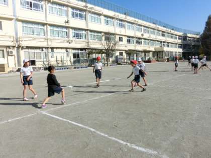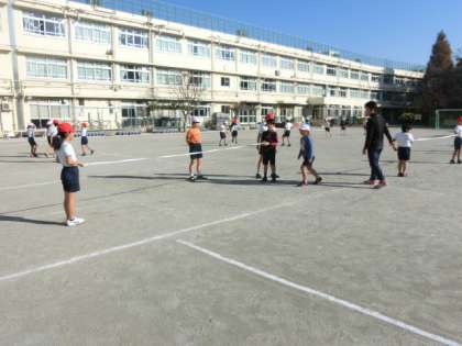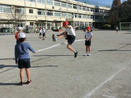 3年生が、ゴムひも使った“高跳び”の学習に取り組んでいました。めあては“短い助走から調子よく踏み切って高く跳ぼう!”です。グループの場で、互いに協力し合いながら、声をかけ合い運動に取り組んでいました。繰り返し練習することで、タイミングがつかめ、調子よく跳べるようになっていました。