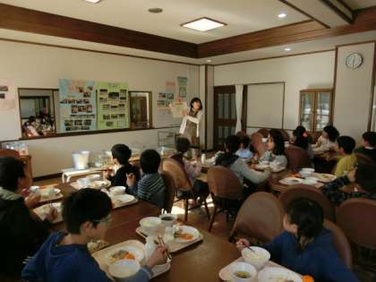 食事を進めながら、栄養士から、子どもたちが好きな食事と苦手な食事、苦手な食べ物のランキングクイズがあり、一人ひとりが考えながら答えていました。また、少しでも苦手な食べ物を食べられるようにすることの大切さ、そのためには、おなかが空くようにすると食べ物が入ること、そして運動することの大切さについての話がありました。