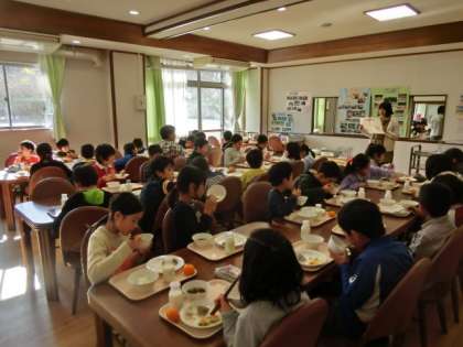 今日のランチルーム給食は、4年3組とつくし学級で3組が交流学級となっているみなさんが、一緒にランチルームでの給食を楽しんでいました。