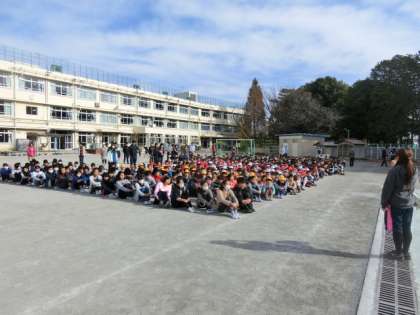 今日の想定は「1階主事室から出火し延焼の可能性があるため校庭に避難する」でした。緊急非常放送を聞き、中休みを校庭や教室、図書室などで過ごしていた子どもたちは、各自が判断して校庭への避難行動をとり、短時間で校庭での人員確認を終わらせることができました。また、校庭での校長からの話や避難訓練担当者からの連絡も、静かにしっかりと聞くことができていました。