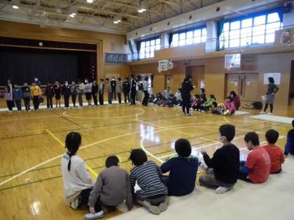 毎回、4つの学級で係を分担して交流会を開いています。今回烏山小は、司会とゲームの担当になりました。司会役は、事前の練習の成果もあり、とても上手に会を進めてくれました。ゲームは、以前児童集会で行った「逆じゃんけん列車ゲーム」を紹介し、たくさんの友達と一緒に楽しく活動することができました。最後に、各学級の6年生が卒業に向けての決意の言葉を発表して、楽しい会が終了しました。