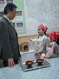 2年生の子どもたちが、家庭科室で作ったみそ汁を、校長室まで持ってきてくれました。具のたくさん入ったみそ汁は美味しそうです。