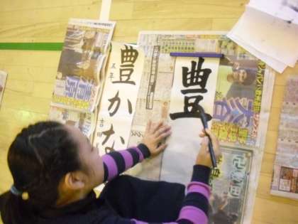 字形や文字の大きさに注意して書くことを目標にして2学期、そして冬休みに練習してきた「豊かな心」を一人ひとりが丁寧に書き上げていました。