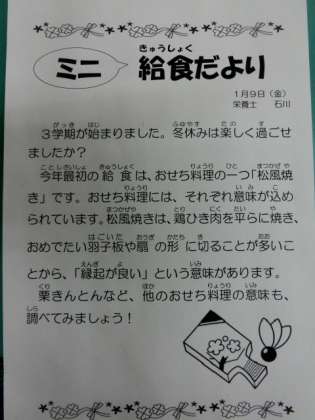 *写真は、今日の“ミニ給食だより”と配膳、1年生の教室の様子です。