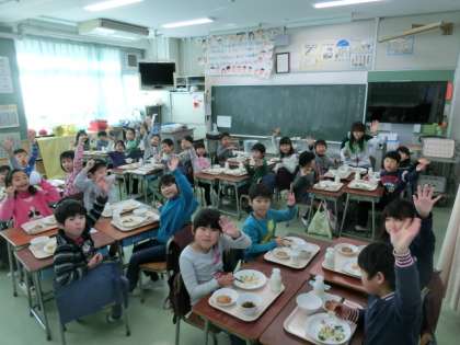 1年生の教室を訪れました。笑顔いっぱい、“とってもおいしいよ!”と口々に話かけてくれました。友達と一緒に摂る食事は最高です。担任の先生もグループに入って楽しいひとときを過ごしていました。