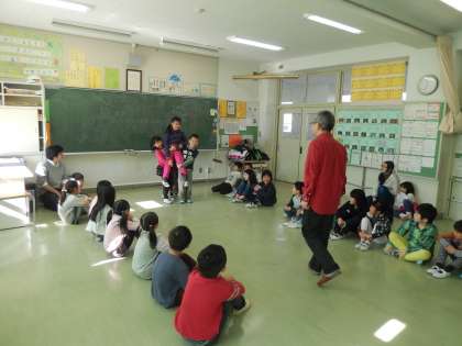 本日は、世田谷パブリックシアターの方をお招きして、教科「日本語」の「物語にでてくる登場人物を演じてみよう」の学習をしました。いろいろなだるまさんがころんだをしたり、物になりきってみたりして、子どもたちも楽しく活動していました。最後には、絵本「一本道を歩いていたら」を読んでもらい、班で工夫して「〜と思ったら」の後を想像し、演じました。みんな役になりきって楽しく演じることができました。