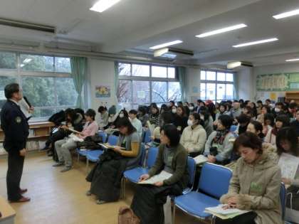 午前中から降り出した雪が校庭にも積もる中でしたが、本校に入学予定の保護者の方々に図書室にお集まりいただき、成城警察署からの交通安全について、学校からの入学へ向けての準備等について、説明をさせていただきました。