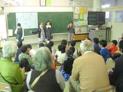 今日は、2年2組がふれあい給食を行いました。司会・はじめの言葉・終わりの言葉も自分たちで行いました。4時間目の出し物では、マジック、ダンス(アナ雪)、一発芸、特技(あやとり・だるまおとし・こま)、お笑い、チアダンスを行い、祖父母の方にも喜んでいただけました。それぞれ一生懸命練習した姿を友達同士見てきたので、「がんばれー。」「できるよ。」「やったね、成功したね。」と言う友達の声も聞こえてきました。給食はナント、リクエスト給食日!!祖父母の方たちと子どもたちの会話も弾んでいました。最後は昔遊びでの交流を行い、こま回しが上手な祖父母の方に「すごーい。」と言う子どもの声や、「子どもたち上手ですね。」という祖父母の方の声もありました。とっても楽しく、すてきな交流の時間となりました。
