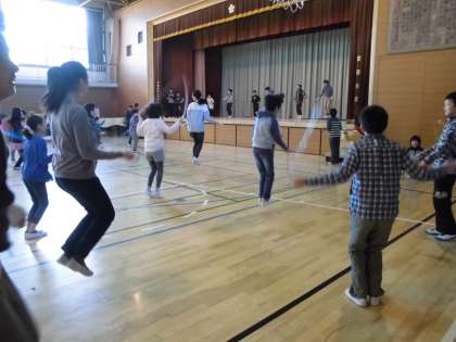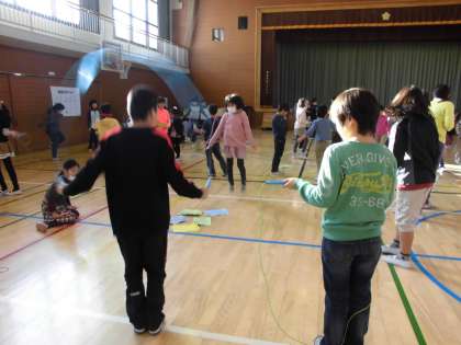 朝、昨日の雪で校庭の状態がよくなかったので、2年生と5年生とつくし学級の児童が体育館で行いました。