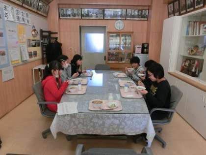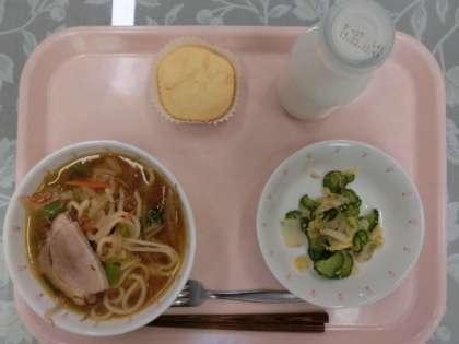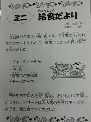 メニューは、チャーシューめん・牛乳・野菜のごま風味・チーズケーキです。自分たちで決めた給食だけあって、朝の登校時から話題になっていました。また、デザートは大人気の手作りのチーズケーキ。2年2組は祖父母の方と一緒に、また校長室では6年生の会食第8グループが、笑顔いっぱいでおいしくいただいていました。