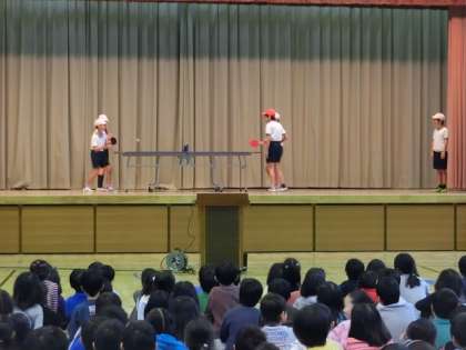 今日のステージ発表は、卓球クラブ、テニスクラブ、バスケットボールクラブの3つのクラブです。活動の様子を紹介したり、活動で大切にしていることなどについて、各クラブの特長を生かしながら発表していました。1年生から3年生のみなさんも真剣に見て聴いていました。