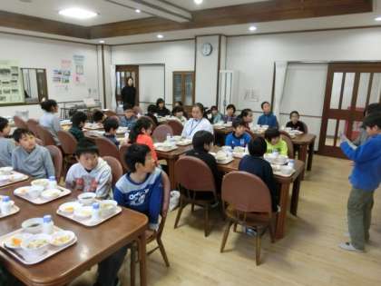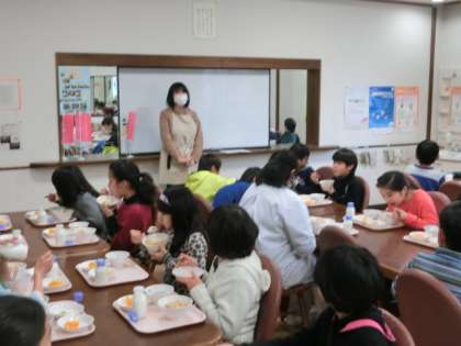 “ランチルーム給食”では、給食調理員の方々も交代で参加してくださり、子どもたちとの交流の時間にもなっています。食事をしながら、楽しく会話を交わしながら給食の時間を過ごしています。また、栄養士からも学年に応じて給食や食育にかかわる話題が提供され、学びの場ともなっています。今日は“残菜を少なくしましょう!”との話でした。子どもたちは真剣に話を聞いていました。