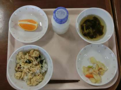 *今日の献立は、親子丼、ラーパーツアイ、すまし汁。ランチルーム給食学級には、デコポンが付きました。