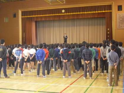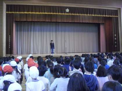 早朝の雨で校庭に水たまりがあったため、体育館で全校朝会を行いました。