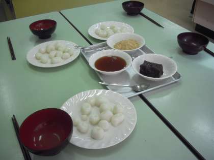 粉から作った白玉に、みたらし、つぶあん、きな粉をかけて、みんなでおいしくいただきました。