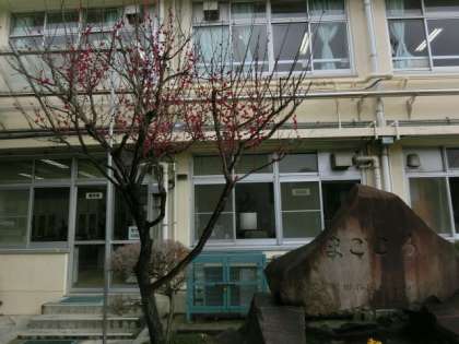 校長室の前・まごころ石の横に植えられている梅の木。今週の月曜日に開花しました。