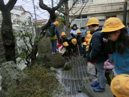 聞いてみると、「先生、カエルの卵があるよ!」とのこと。みんなで池の中の様子を観察していました。