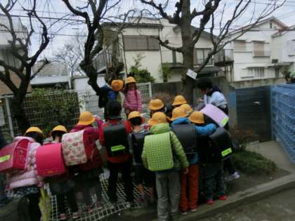 朝、登校してきた1年生が、正門の脇にある池に集まっていました。