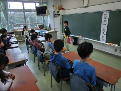 6年生を送る会のすぐ後、4年生は二分の一成人宣言を行いました。