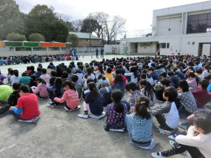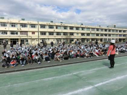 想定は、“放送機器が機能せず、家庭科室から出火した!”でした。出火を確認した教職員が延焼の可能性があることを職員室に一報し、分担して校舎内の各教室や体育館に口頭で伝えて回りました。各教室では、子どもたちが担任からの指示をしっかりと聞き、防災頭巾をかぶり、口にハンカチをあて、“お・か・し・も”の約束を守り、短時間で全員が校庭に避難することができました。