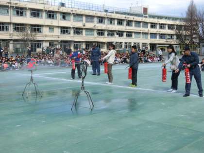 その後、成城消防署烏山出張所の消防士の方々から、避難行動についての講評をいただき、また、消火器の使い方を教えていただきました。6年生全員が、水消火器での体験をしました。上手に扱うことができていた6年生でした。