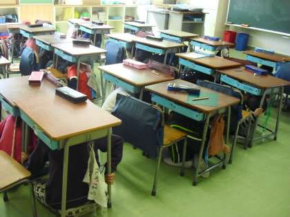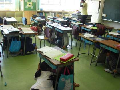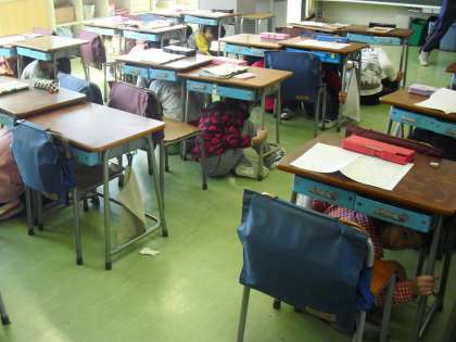 午前9時30分に、区防災無線により訓練の実施が告げられ、本校でも続いて緊急放送を流し、身の安全を図る訓練を行いました。校庭や体育館では中央に集まりかがむ姿勢の確保を、教室では机の下のもぐり頭部や体を入れる姿勢の確保を取りました。落ち着いて素早く行動できた子どもたちでした。