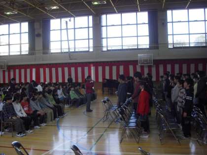 今日の1校時、5年生が卒業式の会場となる体育館の会場設営を行いました。自ら仕事を見付け、率先して行いました。5校時には、紅白幕も張られて式場の雰囲気がある中、5、6年生が合同で練習を行いました。お互いの歌声を聞き、刺激を受け合いながら取り組んでいました。
