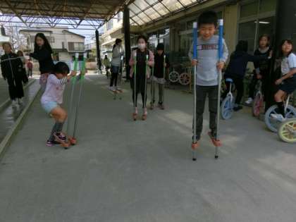 PTAからいただいた新しい“竹馬”で遊ぶ子どもたち、学級遊びで“ドッジボール”を楽しむ1年生など、元気いっぱいに動く様子が見られました。