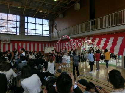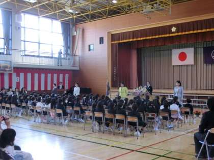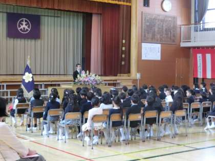 校長の話、お祝いの言葉、PTA会長からの祝辞など、たくさんの話をしっかりと聞いていた子どもたち。“ありがとうございます!”のお礼の言葉もしっかりと行っていました。これからの小学校生活での成長が楽しみです。